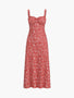 This dress has thin spaghetti straps with a straight neckline and a fitted midi length.
