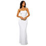 This dress has thin spaghetti straps with an open back and a fitted maxi-length silhouette.