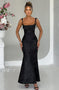 This dress has a straight neckline with thin spaghetti straps and a fitted maxi silhouette.