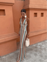 This dress has a halter neckline with a back tie closure and a maxi length.
