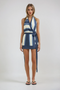 This dress has a halter neckline with a wrap-style front and a side tie closure.
