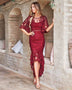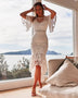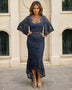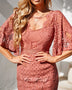 This dress has a round neckline with a sheer overlay and bell sleeves.