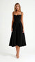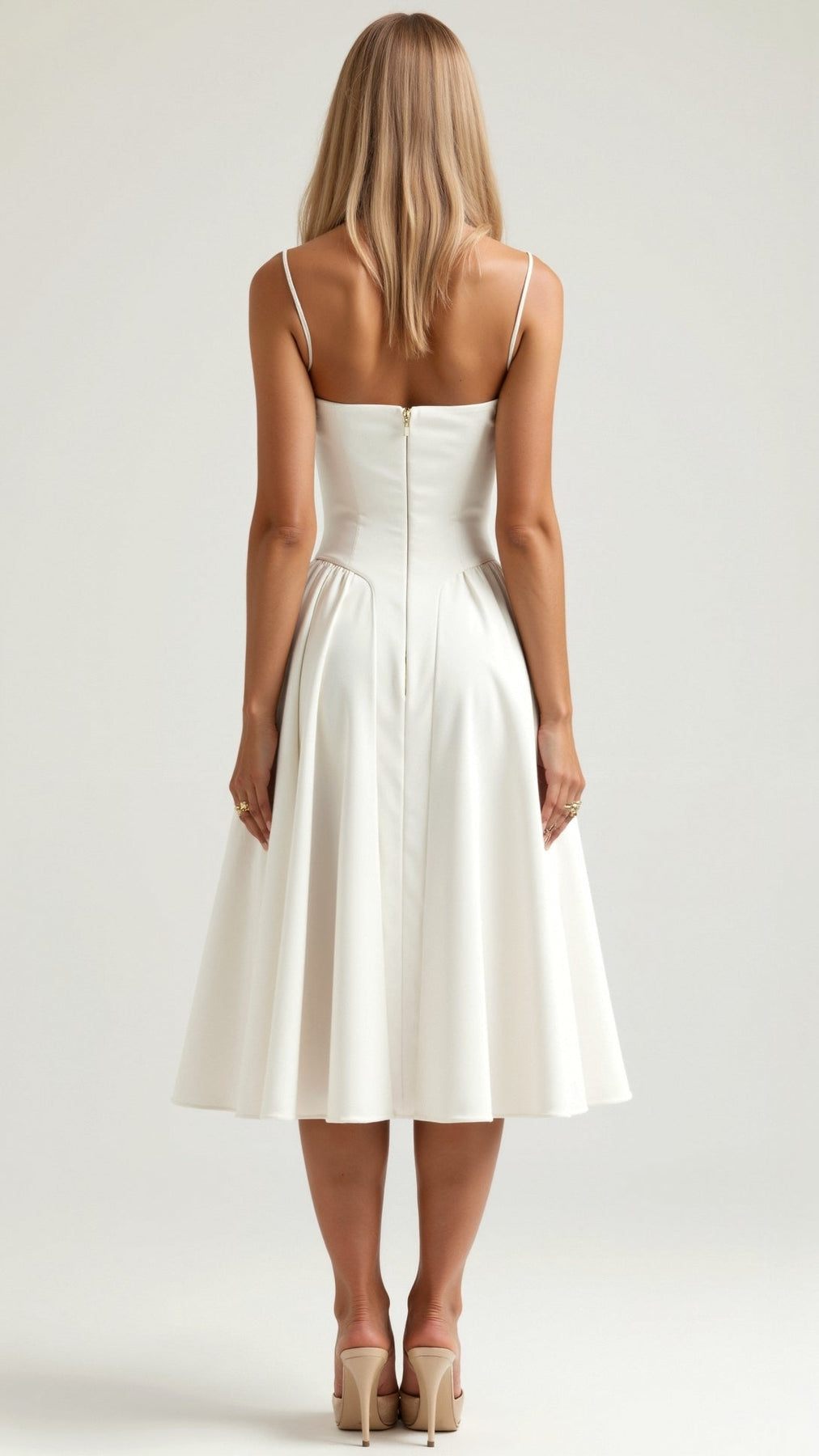This dress has spaghetti straps with a sweetheart neckline and a midi length.