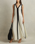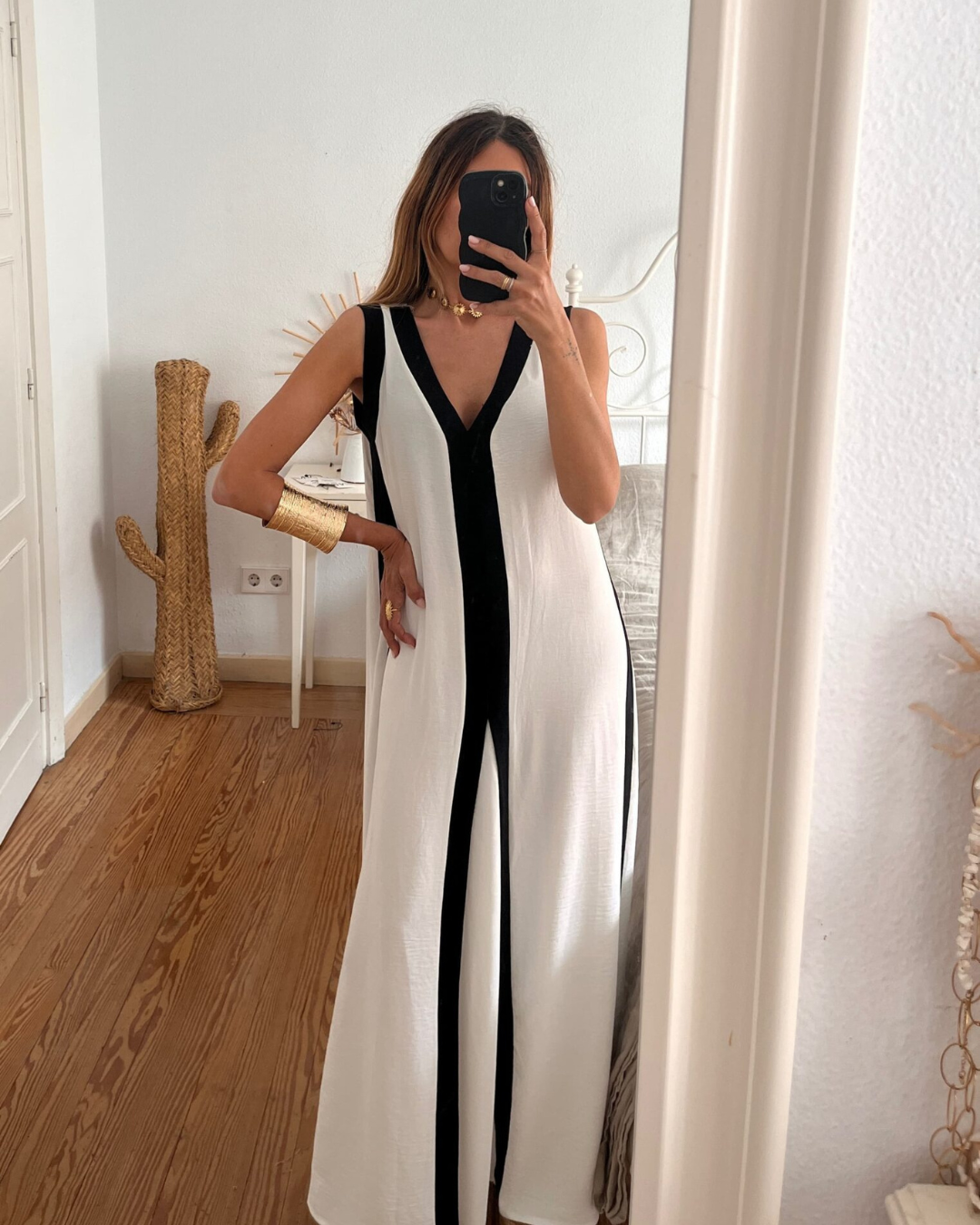 This dress has a sleeveless cut with a maxi-length silhouette and contrast panel design.