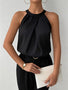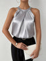 This top has a halter neckline with a keyhole back closure and a sleeveless design.
