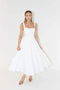 This dress has wide shoulder straps with a square neckline and a flared midi length.