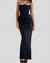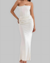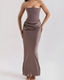 This formal dress has a strapless neckline and a maxi length.