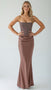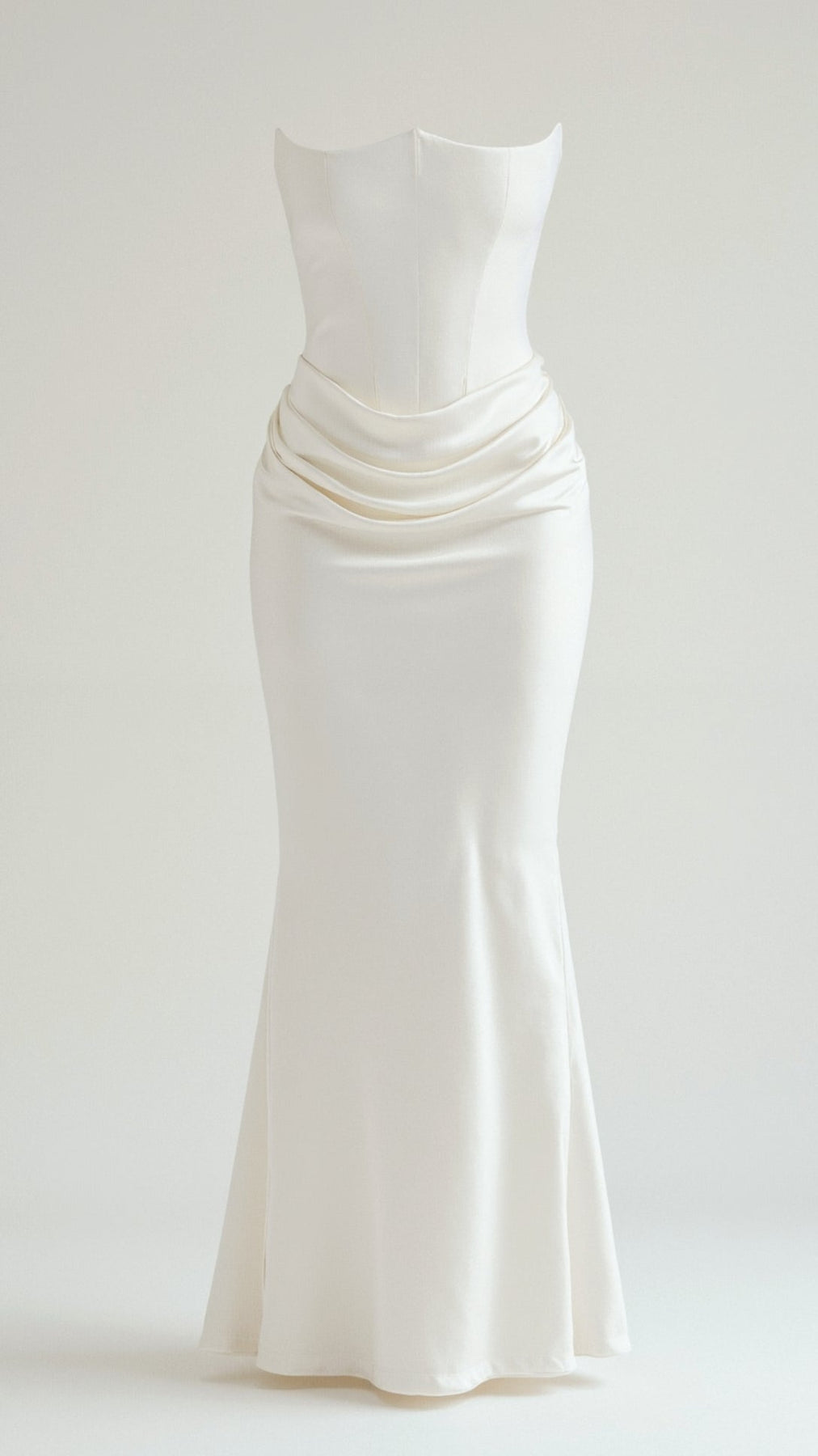 This dress has a strapless neckline with a hidden zip closure and a maxi length skirt.