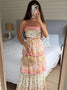 This dress has a tiered silhouette with spaghetti straps and a maxi length.