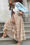 This skirt has a wide stretch waistband and a layered maxi length.