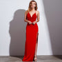 This bodycon dress has a V-neckline and spaghetti straps.