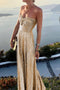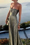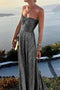 This dress has a strapless design and a maxi length.