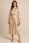 This dress has a high neckline with long balloon sleeves and a midi length.