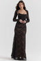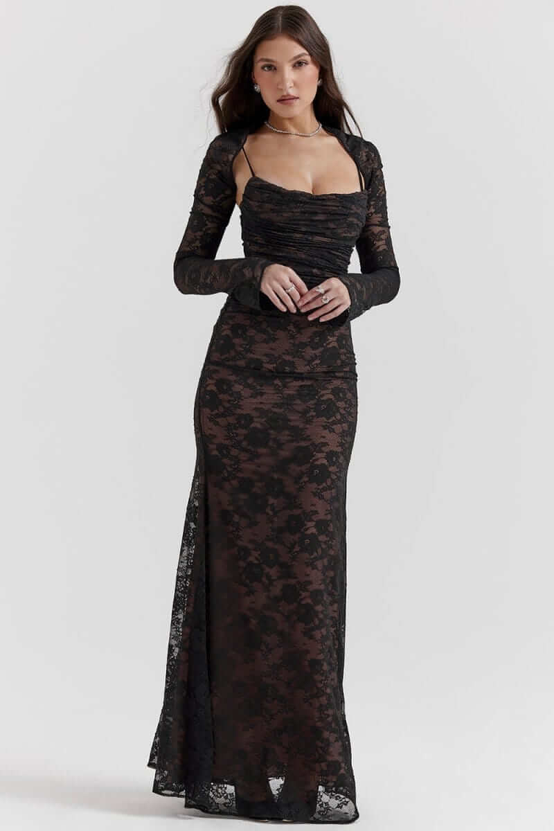 This dress has a sweetheart neckline with long sleeves and a maxi length.
