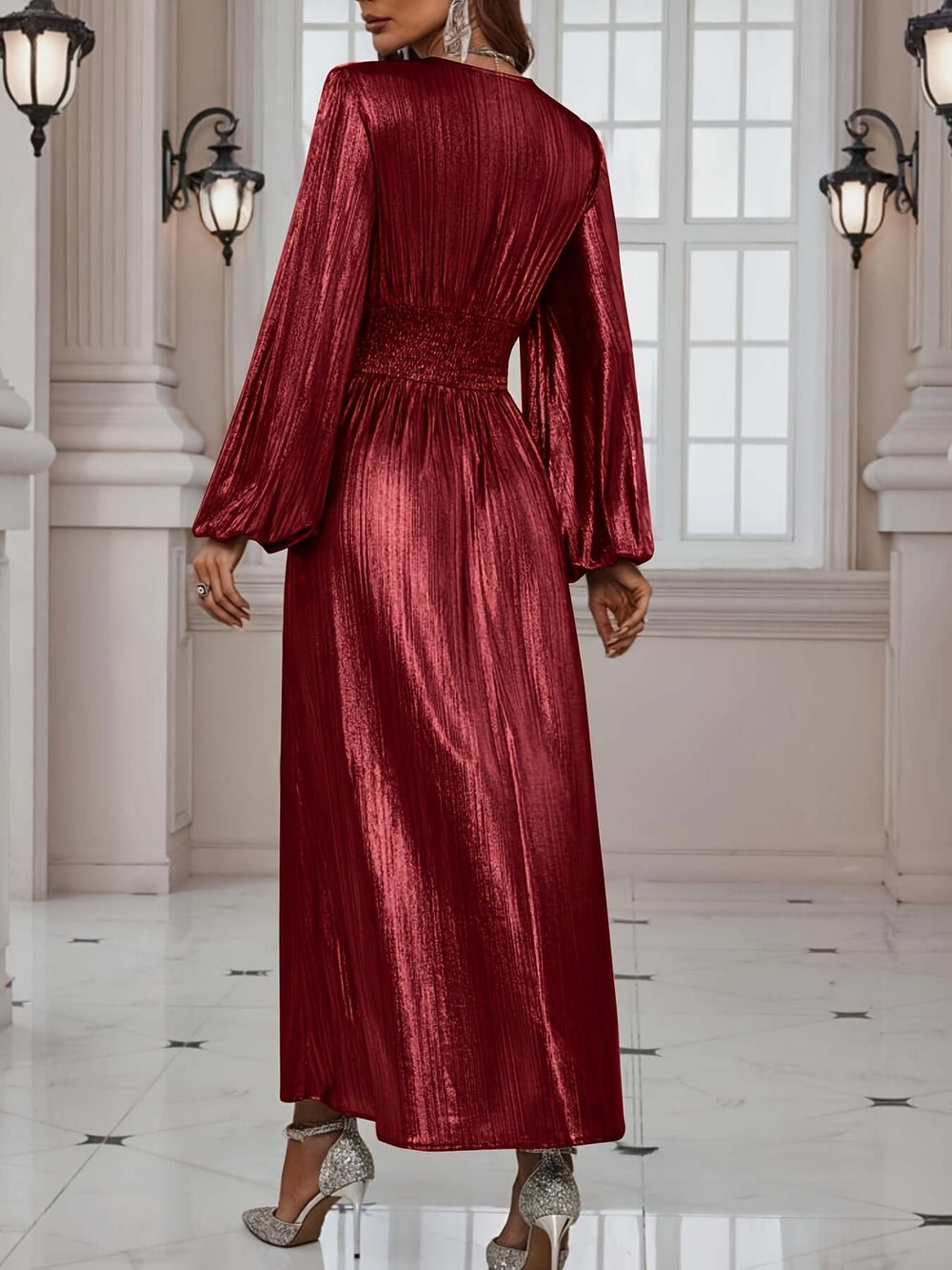 Pleated Maxi Dress with V-Neckline and Balloon Sleeves