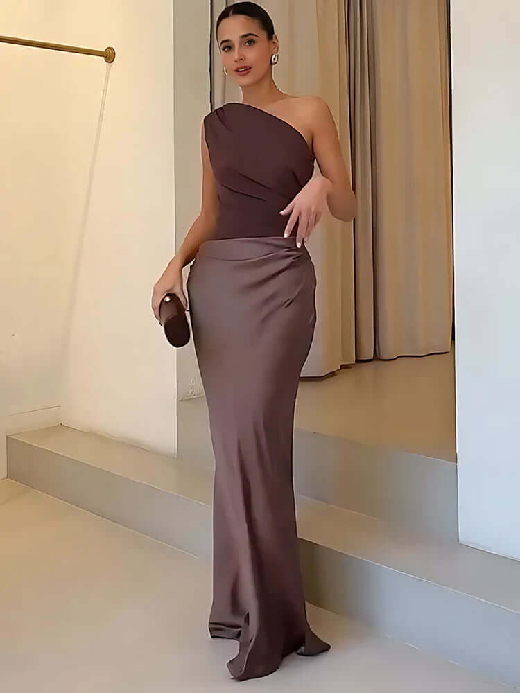 One-Shoulder Satin Maxi Dress with Tie Waist