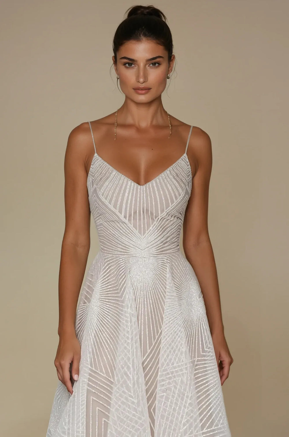 Maxi Gown with Deep V-Neckline, Spaghetti Straps, and Geometric Pattern Overlay