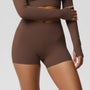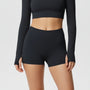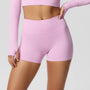 These women’s shorts feature a high-rise waist with an elastic waistband and a pull-on design. The garment has a short cut, a straight hem finish, and a close-fitting shape in the lower area, creating a compact overall form.