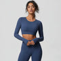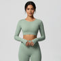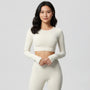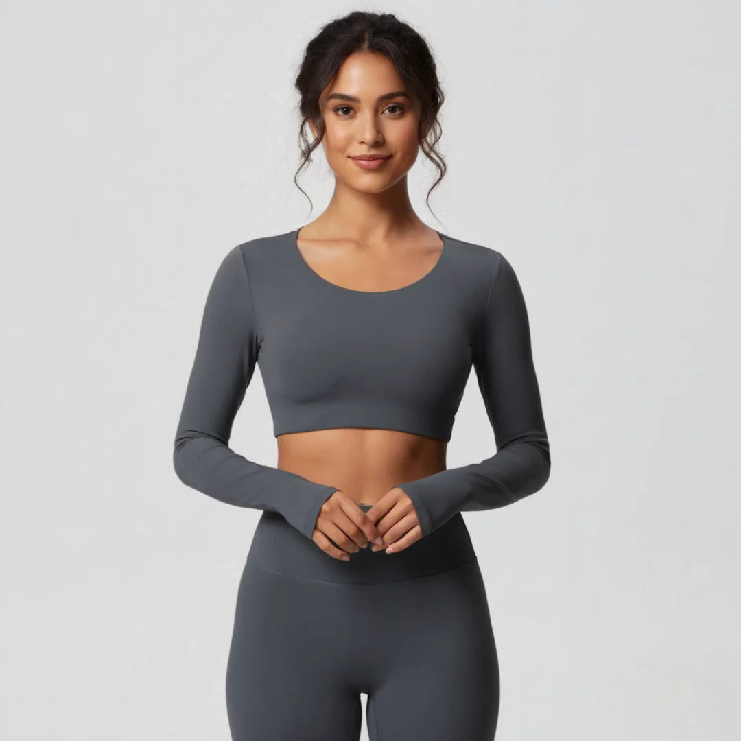 This women’s crop top features long sleeves with a straight cut and a cropped hem length. The design includes a crew neckline and a pullover construction, creating a short upper-body silhouette.
