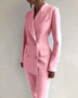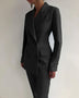 This blazer and trousers set has a double-breasted blazer with button closure and long sleeves.