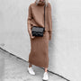 This two-piece set has a turtleneck neckline with long sleeves and a maxi length skirt.