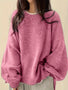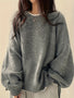 This sweater has a round neckline with long sleeves and an oversized fit.