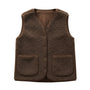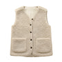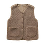 This vest has a V-neckline with a front button closure and two patch pockets.