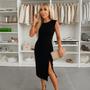 This dress has a sleeveless design and a boat neckline.