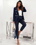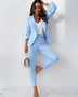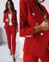 This set has a double-breasted blazer with long sleeves, notched lapels and a button closure, paired with straight leg trousers.
