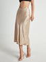 This skirt has a midi length with bias-cut construction and an elastic waistband.