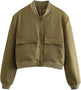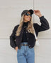 This jacket has a cropped length with a snap button closure and long sleeves.