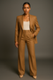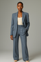 This suit set has a single-breasted blazer and full-length trousers.